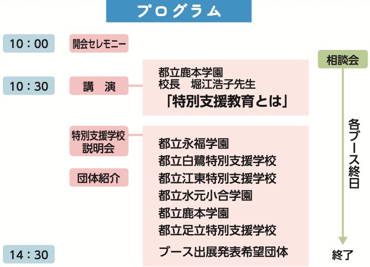 - 都内特別支援学校高等部、普通科・通信制・単位制高校、チャレンジスクール等その学びの内容の紹介と個別相談。特別支援学校の学習内容も各校によって異なるため、普通科だけでなく職業科といった専門課程の紹介