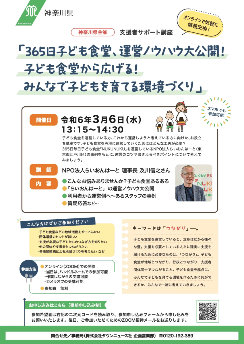 神奈川県庁 主催 支援者サポート講座「365日子ども食堂、運営ノウハウ大公開! 子ども食堂から広げる! みんなで子どもを育てる環境づくり 」